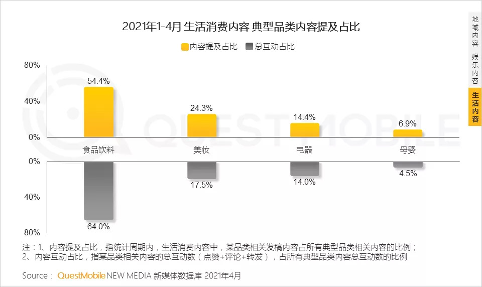 8、用户日常晒出的吃喝玩乐类内容能展现其生活消费的偏好,其中食品饮料类消费内容占比超一半,美妆次之