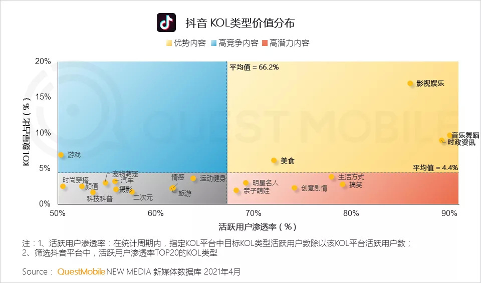2、抖音平台中优势、高竞争内容类型较为集中,音乐舞蹈、影视娱乐、美食类内容火热