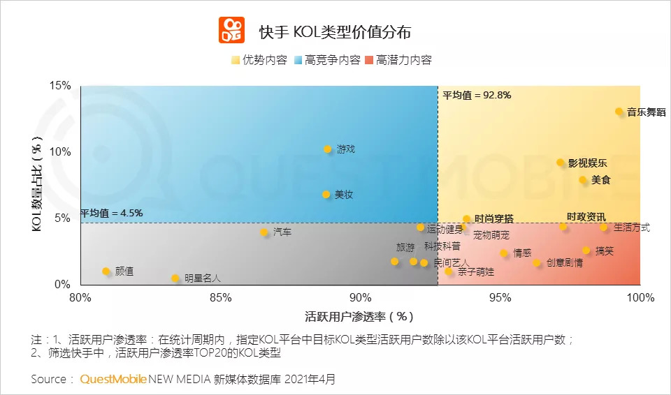 3、快手平台中低供应高需求的潜力内容类型丰富,宠物、生活方式、亲子萌娃等垂类内容具备一定潜力