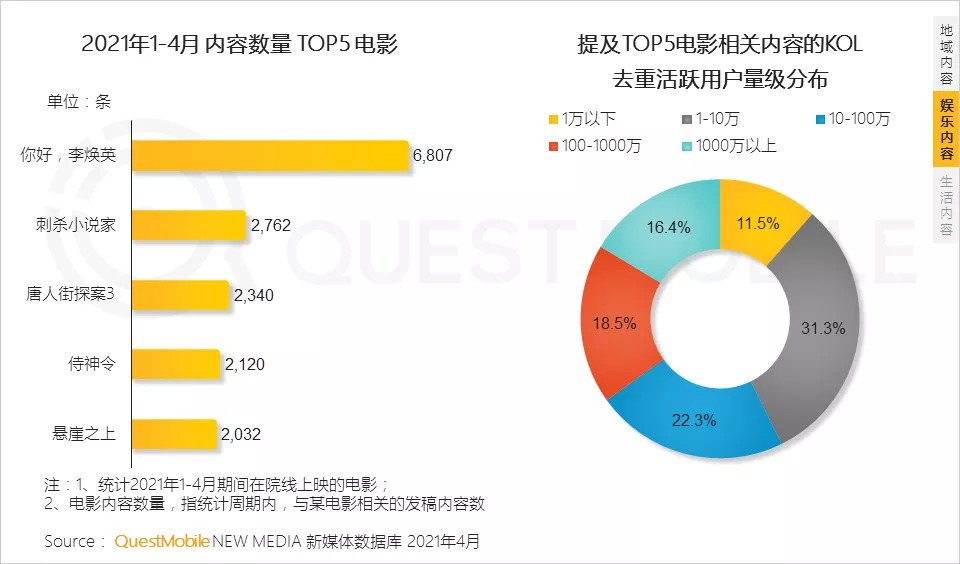 7、热门电影的相关内容相比于电视剧、综艺数量较低,发布者活跃用户数在100万以上KOL的比例最高,其中不乏电影主创、参演明星