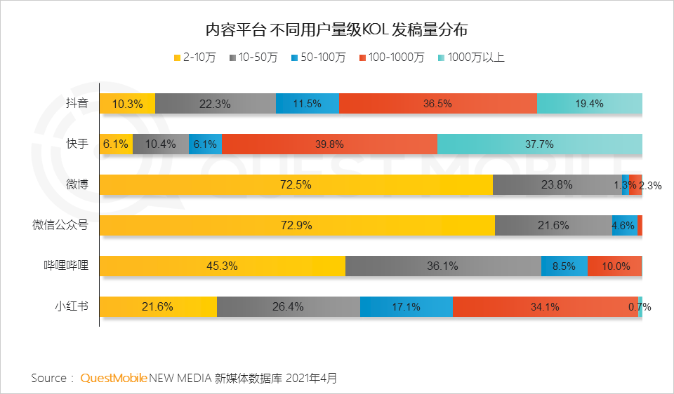 2.4 抖音、快手活跃用户在百万级以上KOL发稿量占比均超六成,小红书各层级较为均匀,其他平台发稿KOL以2-10万活跃用户量级为主