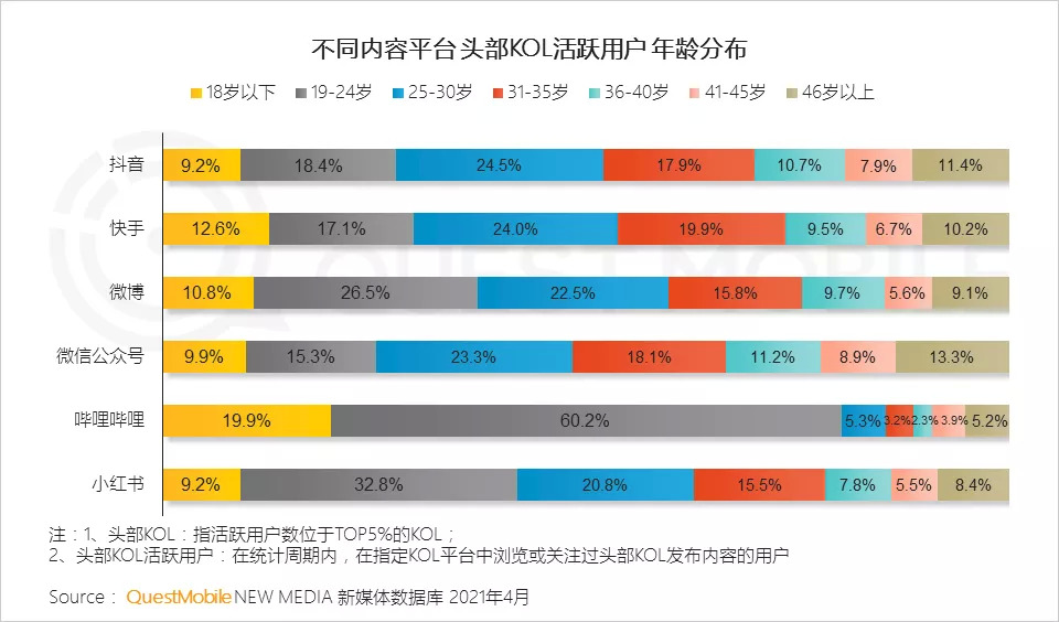 3.3 各平台头部KOL活跃用户数以30岁以下年轻人居多,其中哔哩哔哩年轻化特征突出,微信公众号更吸引36岁以上人群