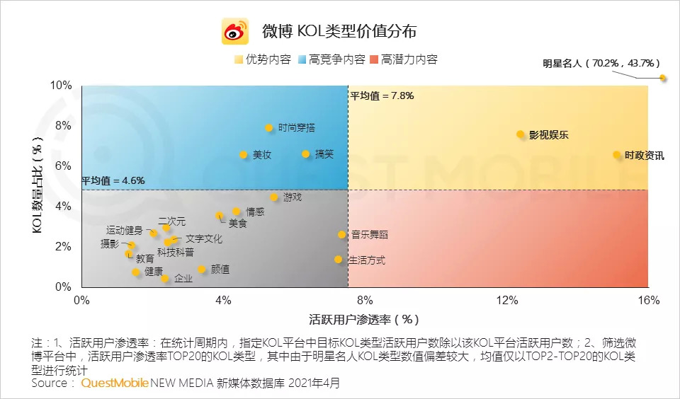 4、微博基于热点推荐和转发机制的内容体系,成为娱乐类内容的大本营,明星名人、影视娱乐类KOL最为活跃
