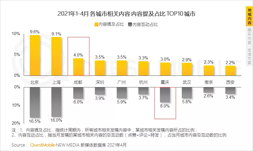 2、北京上海相关内容数及互动量遥遥领先,除此以外的城市内容热度相当,成都与重庆是仅次于北上的“网红”城市