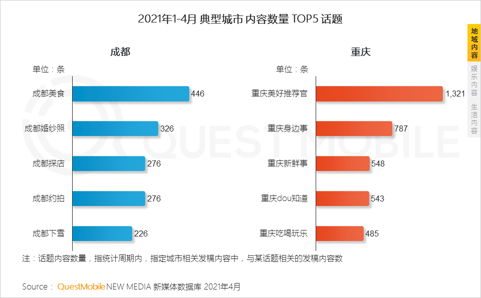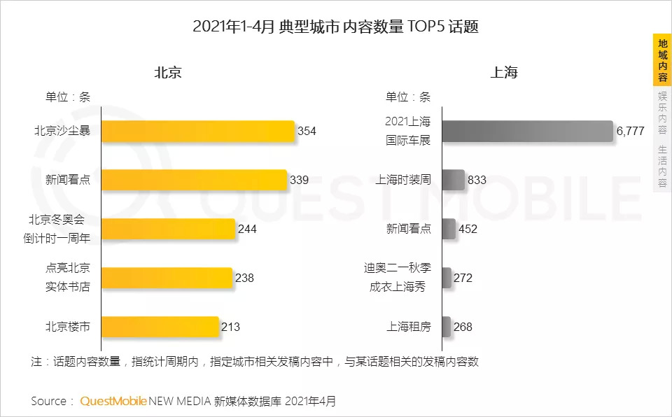 3、北京、上海话题以时事为主,成都、重庆的生活气息浓厚,探店、约拍、吃喝玩乐、身边事是最热门话题