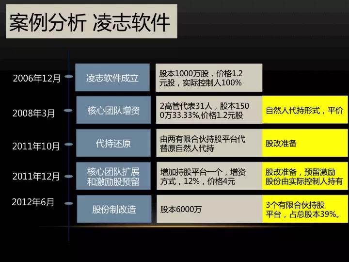 第二年的6月份股份制改造完成,6000万股,一共三个有限合伙持股平台占了39%的股票,这个时候实际控制人拿了50%几的股份,因为两个高管还拿了一些。三个有限合伙39%的股份。到了2013年的12月,这是我到了这个公司以后,叫做第三持股平台里面的预留股转让,又过了一年多,这个时候为什么要转让了?因为我们要去上市和挂牌了。2013年底是一个非常重要的时间节点,凌志软件要以2013年的数据去挂牌,因为当时我们决定是去IPO。