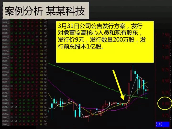 我顺便另外找了一个案例给大家分享。这个是3月31号的某科技公司的公告,他的发行方案,他是这样做的,发行对象是董监高、核心人员和现有股东,发行价格是9块钱,他之前的价格一直在6块钱左右徘徊,他比现市价高了50%,发行200万股,他的总股本1亿股,发行2%,就大肆宣传,说核心团队如何如何让大家有信心之类。你觉得这个方案怎么样?我是觉得这个方案其实只有一个作用,就是发信号。就是说我们都很有信心,我们对这个公司很有信心,特别是董监高,我们对这个公司特别有信心,所以现在价格是6块钱,我们愿意9块钱去买。我就想了,兄弟们买股票市场上6块钱买了算了,你还9块钱买干啥,有钱干点别的不好吗?没想通。