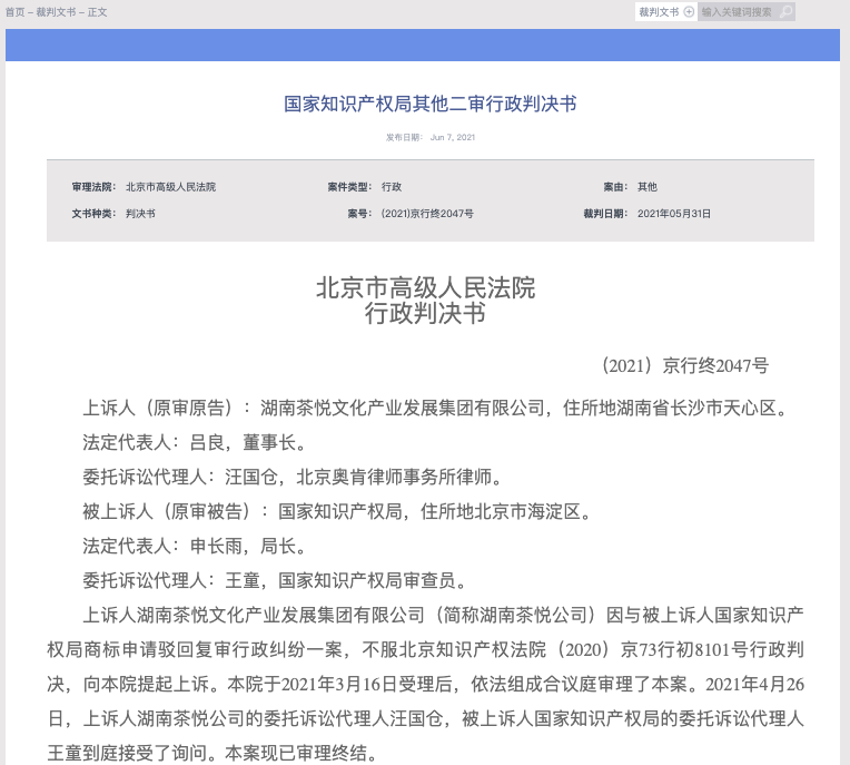 据天眼查APP显示,北京法院审判信息网于6月7日公开关于湖南茶悦文化产业发展集团有限公司(简称湖南茶悦公司)的《国家知识产权局其他二审行政判决书》,案号(2021)京行终2047号,审理法院为北京市高级人民法院。