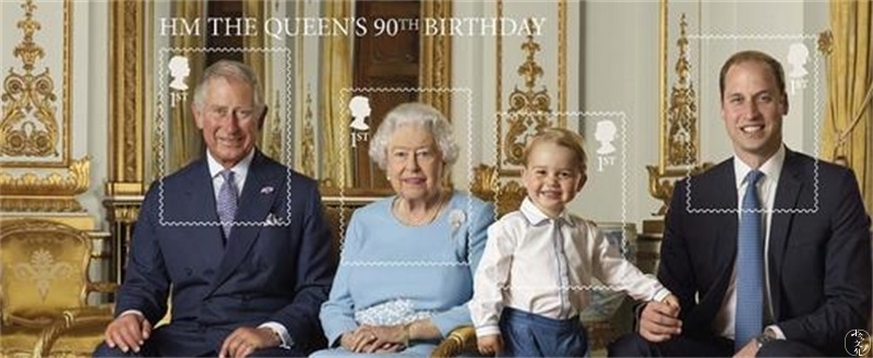 邮票中,伊丽莎白女王、查尔斯王子、威廉王子和三岁的乔治小王子一起出镜,第一次拍纪念邮票的乔治小王子握着爸爸的手咧嘴萌笑。