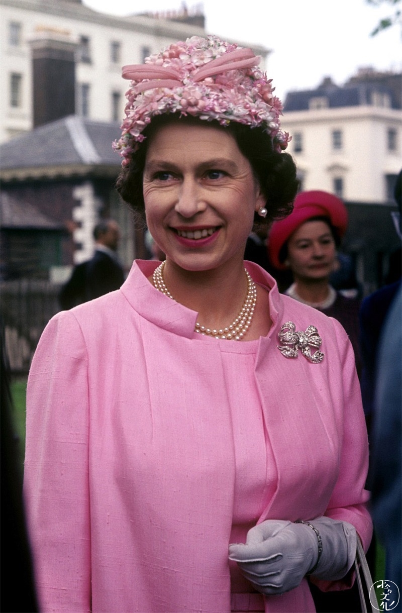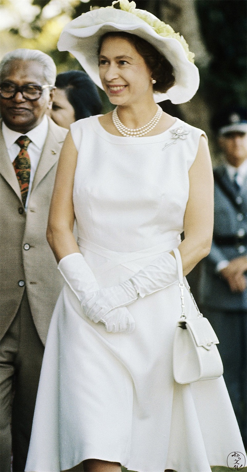 从这两套衣服可以看出来女王是喜欢有点古怪的小设计,无论是1965年在以色列的橙色套装还是1971年在塞舌尔,一个热爱蝴蝶结和镂空工艺设计的活泼女人,虽然岁月已经开始在她脸上留下了印痕。