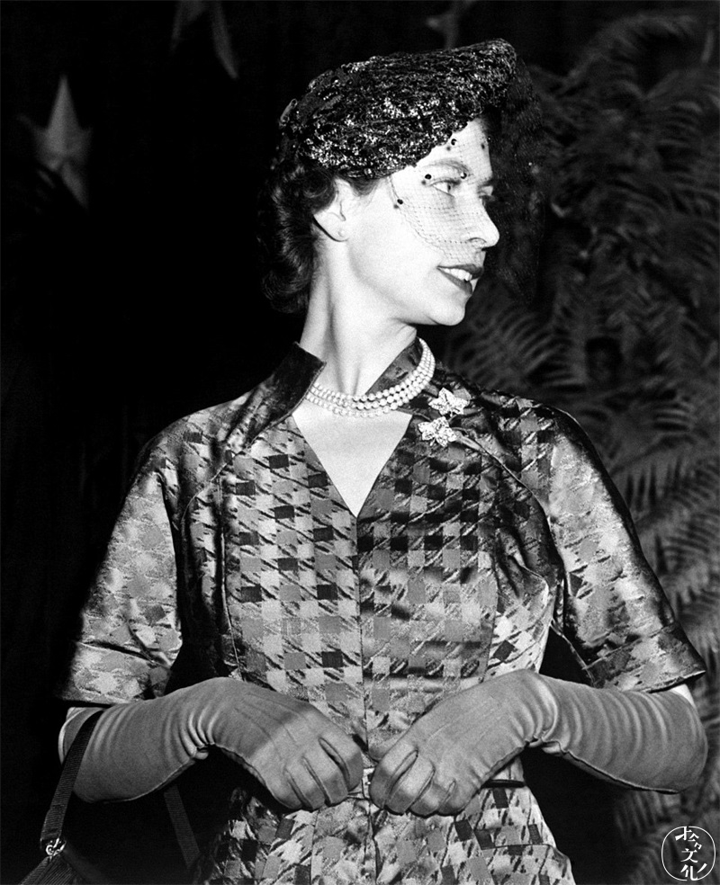 伊丽莎白女王婚后一个月,当她确定为王位继承人之后的第一次旅行,她用低沉的方格棱纹裙(特别注意一下她特别在领口别的钻石胸针),好像是从旧时代的爵士画报里走出来的绝世名伶,闪着一圈一圈银色的光辉,坚定气质的长手套,证明着她的时尚品味,她骨子里蕴藏的艺术修养,从来都历久弥新。
