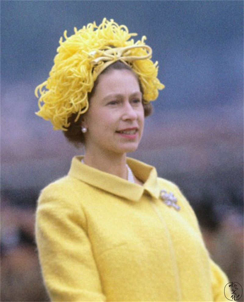 和这款帽子相似设计的是1977年旅行中带的黄色,女王一直钟爱天蓝色和鹅黄色。