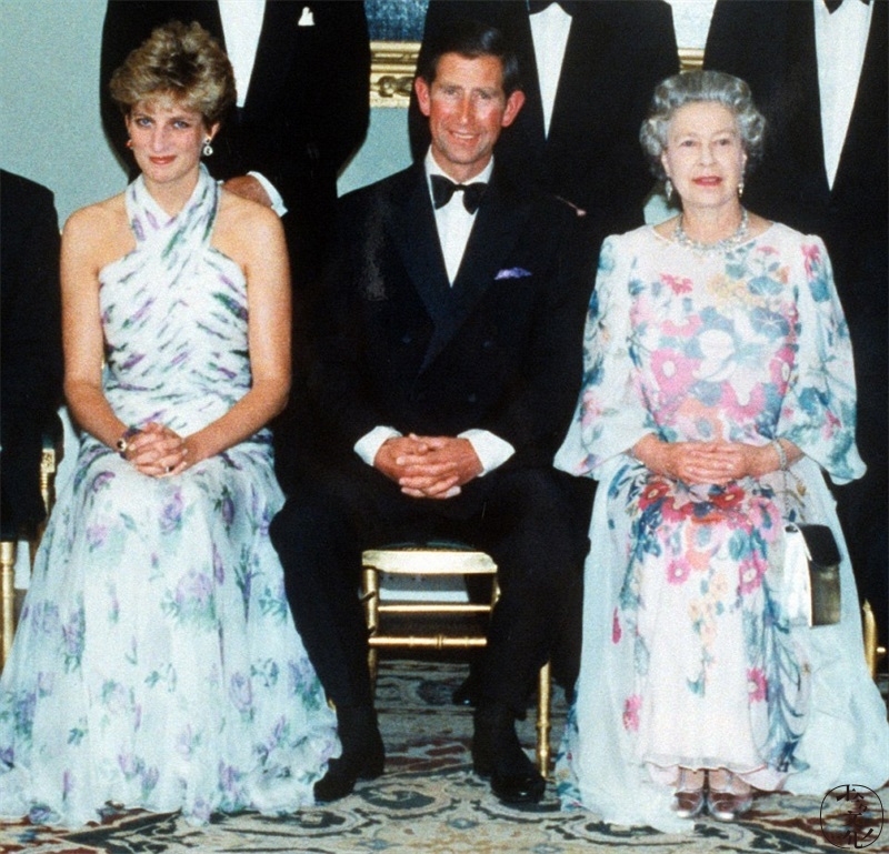 在1992年,她和戴安娜王妃拍了一张这样的合影,一改以往珍珠项链的固定搭配,她连项链都改成了抽象的花朵形状,更不用说这一身花裙子了,现在的她,66岁。