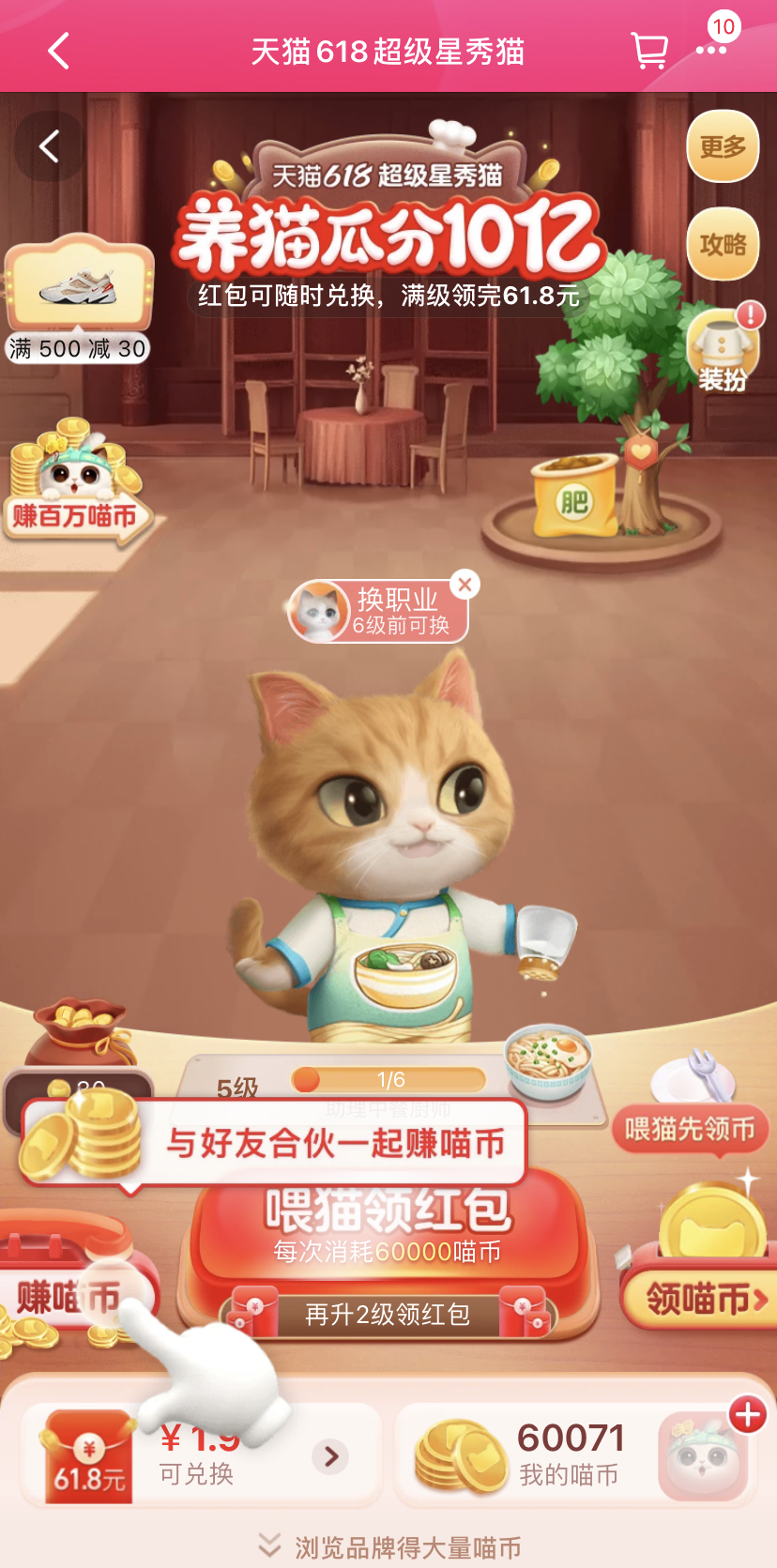 不过,只是没有PK环节,游戏还是有的,主要是领取喵币换红包。