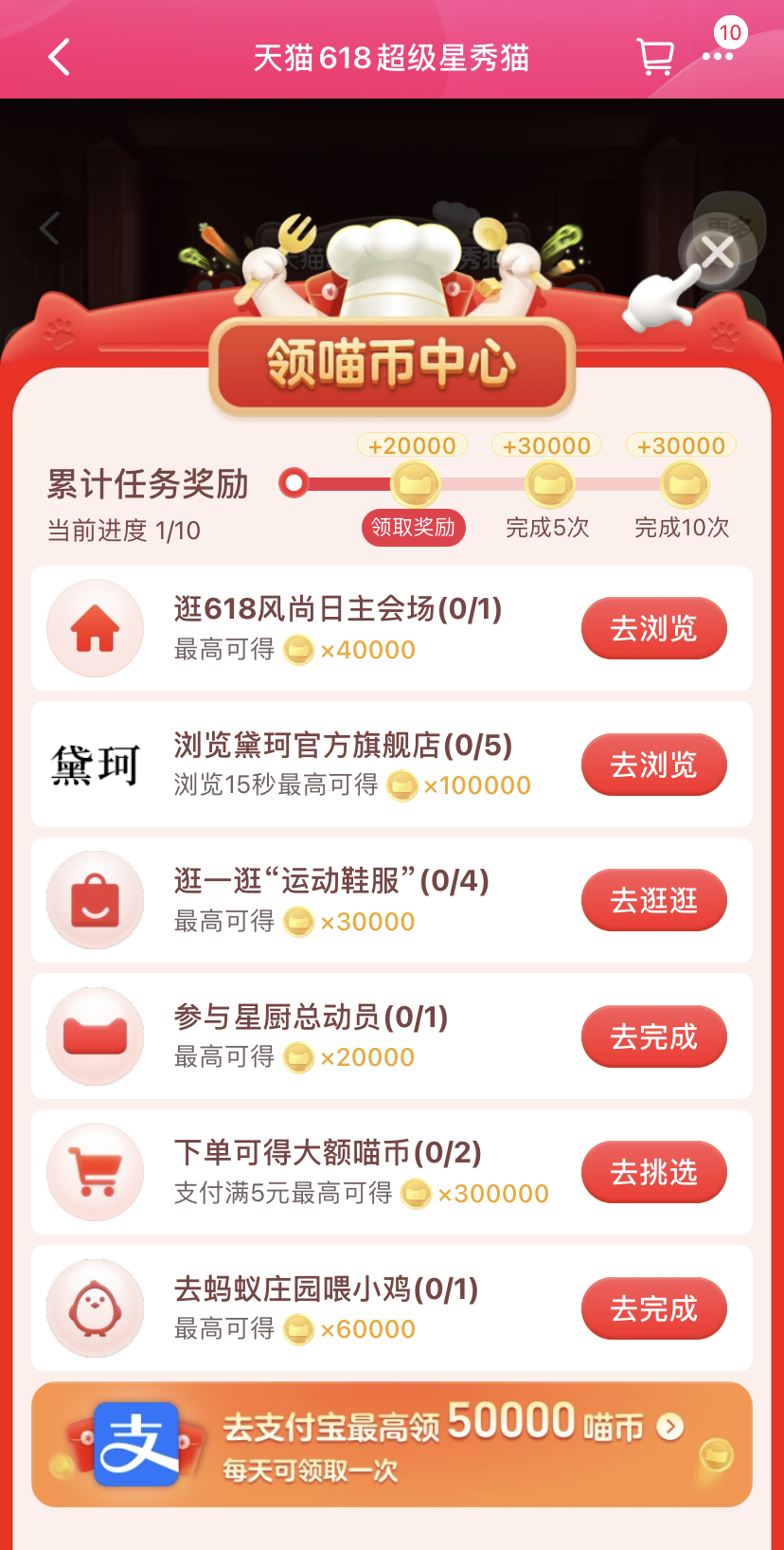 根据官方游戏规则,获取喵币的途径可分为:浏览会场和店铺、互动得喵币、领取自繁殖宝箱、支付宝领喵币、合伙经营赚喵币(组队)和星厨任务。