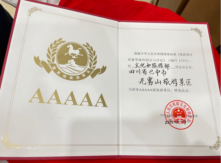 根据中华人民共和国国家标准《旅游景区质量等级的划分与评定》(GB/T 17775),经文化和旅游部评定并公告,四川省巴中市光雾山旅游景区为国家AAAAA级旅游景区。
