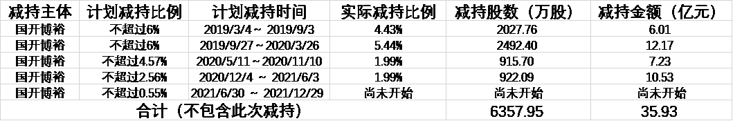2019年1月,国创开元首次提出了减持计划,2月国开博裕提出减持计划。此后的二年半时间里,二者连续5次提出不超过6%的减持计划。