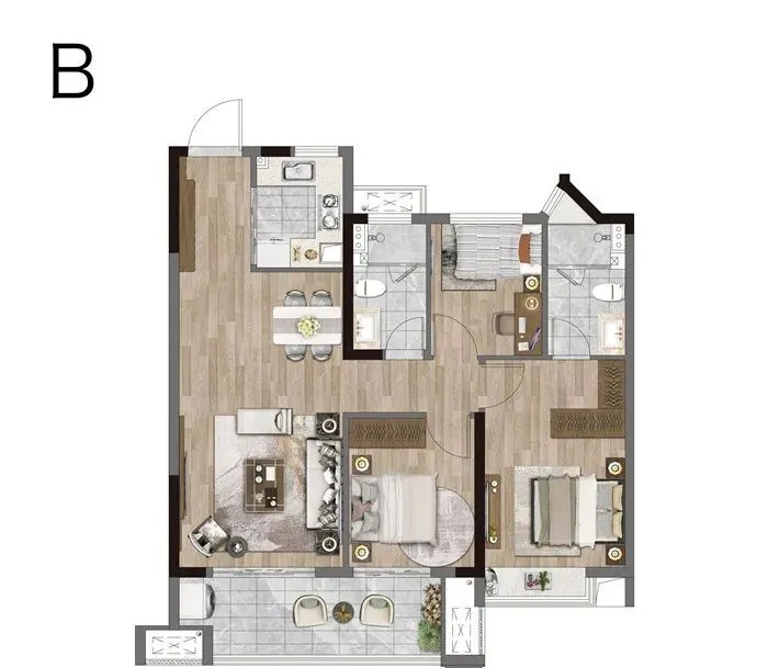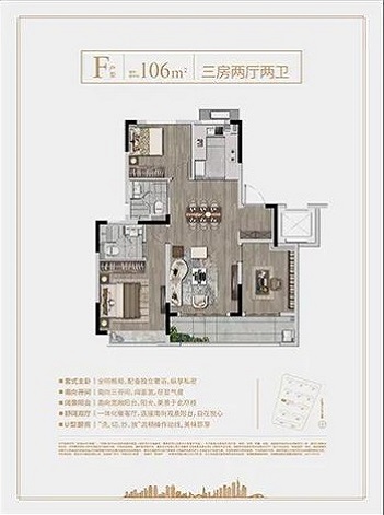 项目配备中央空调、地暖、双向流新风系统“三大件”,墙纸、木质地板均为交付标准;