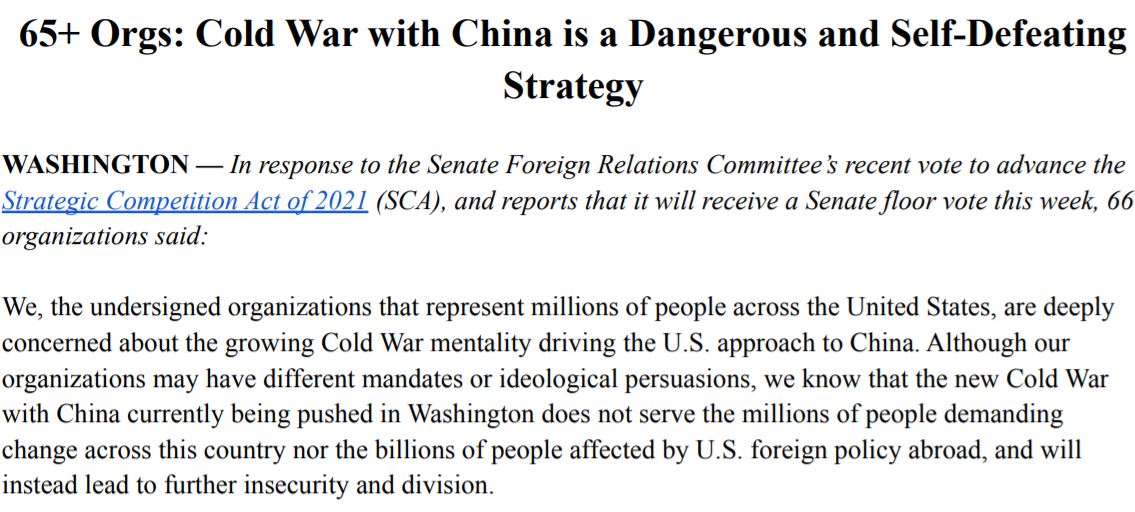 上月,美国66家机构和组织发表联名信,也指责《美国创新与竞争法》充斥冷战思维。联名信指出,该法案的反中国框架不仅在政治上毫无必要,同时还将产生负面作用,煽动美国的种族主义、暴力、仇视外国人和白人民族主义。