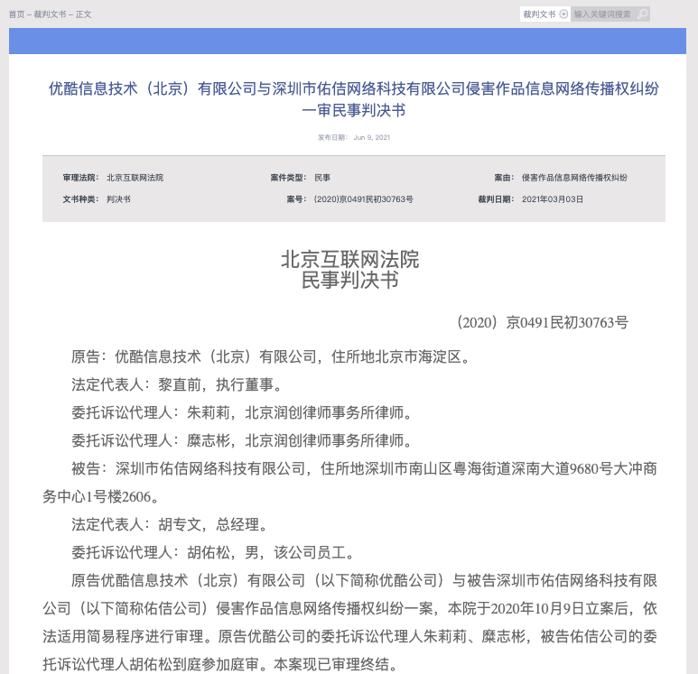 据天眼查APP显示,6月9日,北京法院审判信息网公开优酷信息技术(北京)有限公司与深圳市佑佶网络科技有限公司侵害作品信息网络传播权纠纷一审民事判决书,案号(2020)京0491民初30763号,审理法院为北京互联网法院。