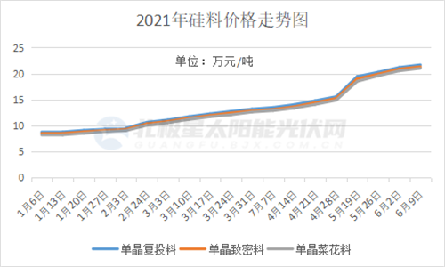 今日,硅业分会发布了国内太阳能级硅料最新的成交价,本周硅料价格持续上涨,但涨幅有所收窄。其中,国内单晶复投料价格区间在21.0-22.1万元/吨,成交均价为21.68万元/吨,周环比涨幅为2.31%;单晶致密料价格区间在20.7-21.9万元/吨,成交均价为21.31万元/吨,周环比涨幅为2.01%。