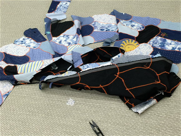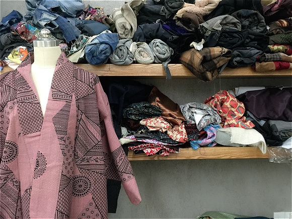 就在今年年初,“再造衣银行”工作室搬到了宁夏路上的一栋办公楼内,空间变得更大。一进门就会看到堆满架子的旧布料、散落在工作台上的半成品、墙壁上逻辑清晰的资料图片,以及模特身上等待被解构的和服与牛仔衣。