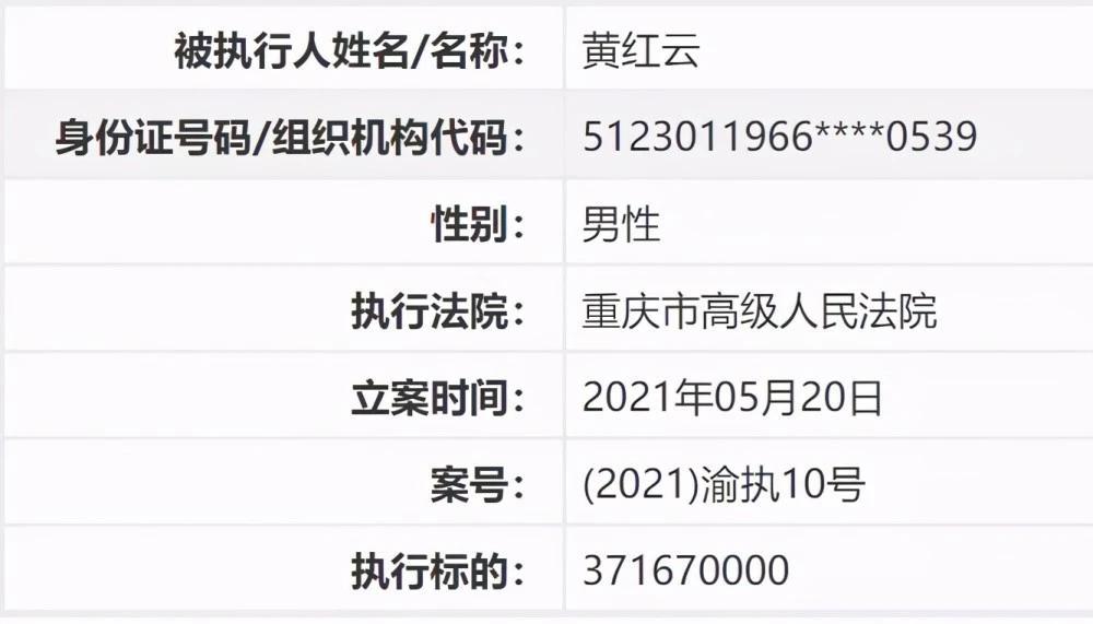 中国执行公开信息网显示,黄红云当前位列被执行人,执行标的3.7亿元,立案事件2021年5月20日。该事件被媒体报道后,5月23日,金科股份就此事件发出公告中首次披露,黄红云被执行与离婚事件有关。
