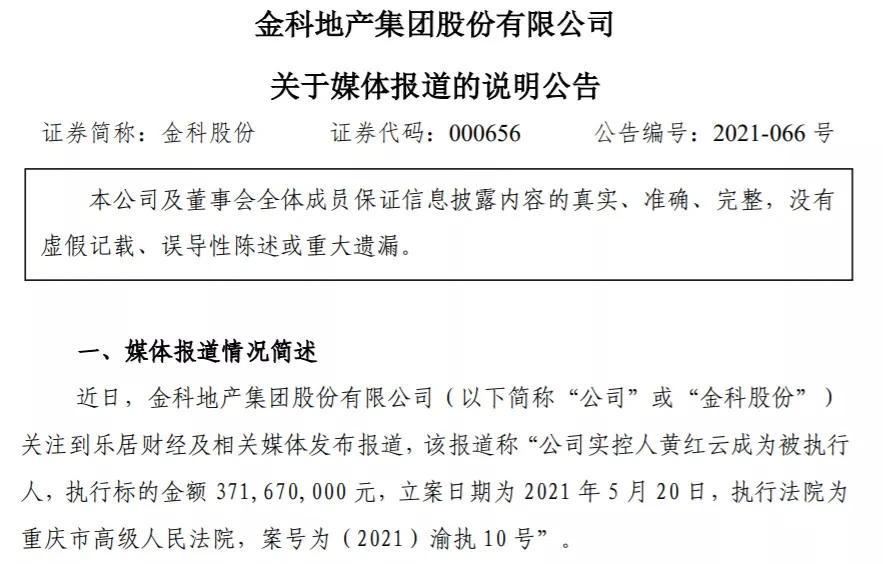 5月31日,金科股份再次发出澄清公告称,“黄红云被列被执行人”事件始自2017年与前妻陶虹遐离婚后涉及的股权分割引起的分歧。