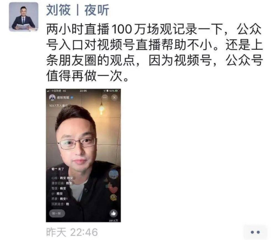 不过由于每个人所积累的社交资产是不一样的,尤其是公众号本身可与视频号进行绑定和直播的时候,视频号本身即使不需要大V也是能在局部一点个体之中获得大量的流量。比如公众号“夜听”的运营者情感主播刘筱曾在两小时就实现了超过100万人观看。