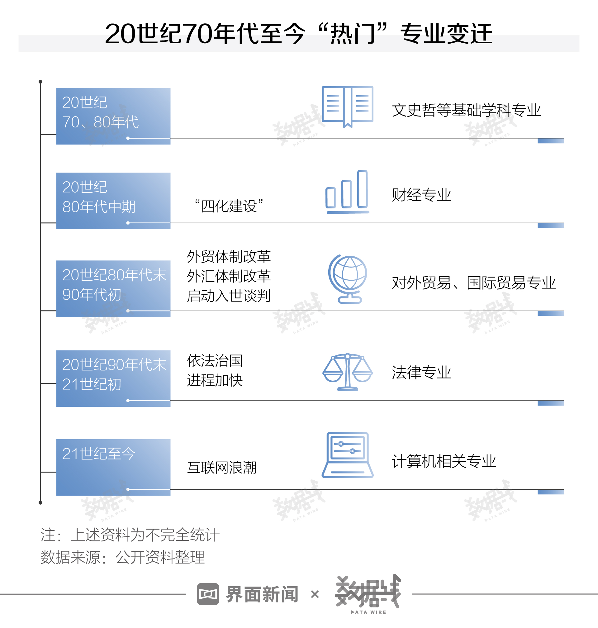 千万人竞争的“高考”结束了,“专业”选择拉锯战蓄势待发。自1977年高考恢复以来,伴随中国经济产业结构不断调整,“热门”专业在45年间经历了由“文史哲等基础学科专业”“财经专业”“对外贸易、国际贸易”“法律专业”到“软件工程”等计算机相关专业的转变。
