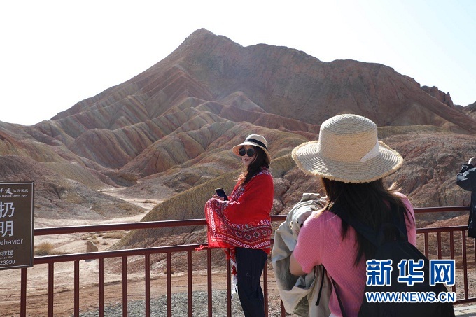 游客在张掖七彩丹霞景区拍照留念。新华社记者 李杰 摄