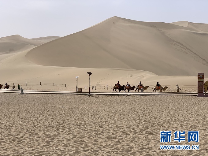 敦煌鸣沙山月牙泉景区内,游客骑着骆驼感受沙漠之美。新华社记者 李杰 摄