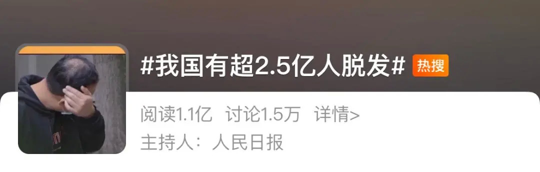 5月28日是“全国爱发日”,当天#我国有超2.5亿人脱发#一话题冲上热搜。数据显示,平均每6人当中就有1人饱受脱发困扰,且26-30岁是脱发的“高发”年龄段,脱发年轻化已经成为近年来脱发人群的关键词。