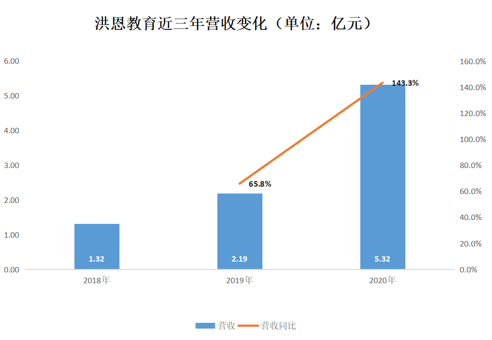 纵观洪恩教育近三年的收入变化,明显呈上升趋势;但其在利润上一直处于亏损状态。2018年营收1.32亿元,2019年同比增长65.8%至2.19亿元;2020年实现营收5.32亿元,大涨143.3%。2018-2020年,其分别实现净亏损1760万元、2.76亿元、3750万元。