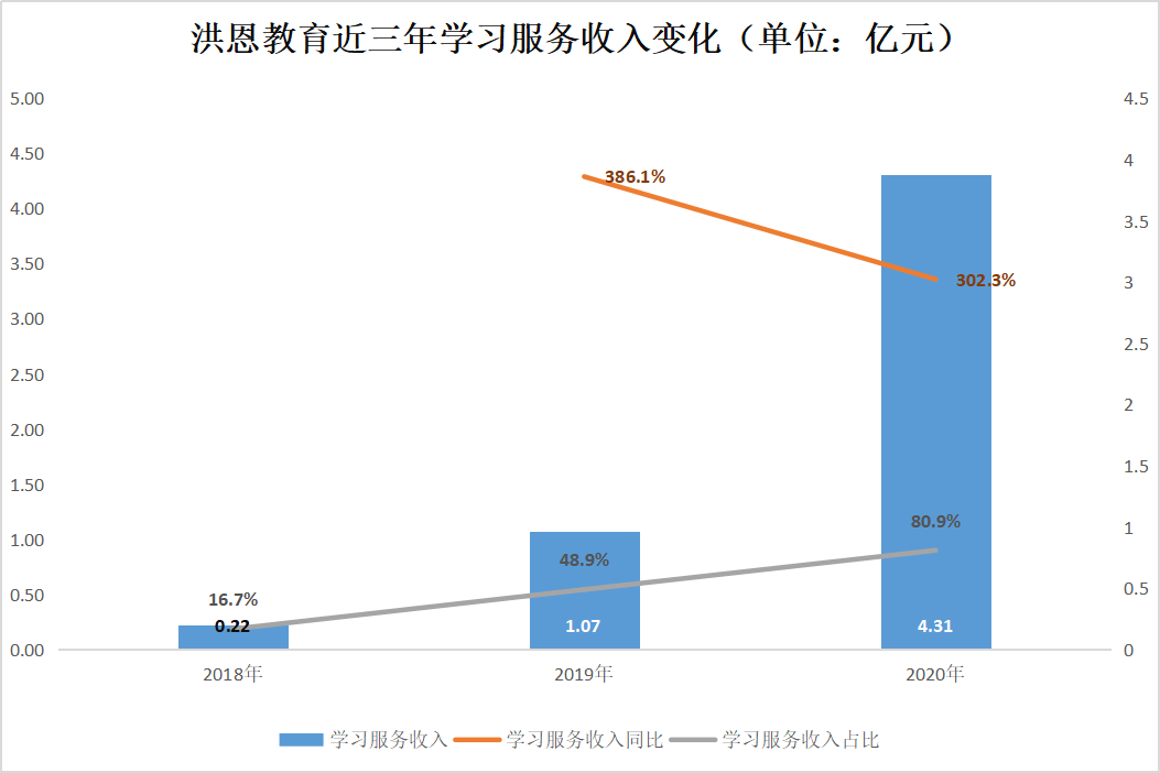 放大到年度来看,2018年学习服务营收0.22亿元,占比近17%;2019年同比增长386%至1.07亿元,占营收比重已近一半;2020年更是达到4.31亿元,占营收比重超八成。
