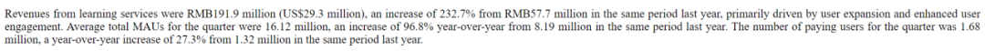 用户规模方面,洪恩教育2021财年Q1平均月度活跃用户数(MAU)为1612万,较去年同期的819万增长96.8%。一季度付费用户数达168万,较去年同期的132万增长27.3%。