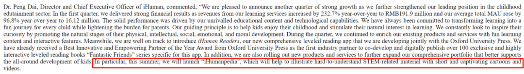 另外,除语数英产品外,洪恩教育正尝试向素质教育的方向拓科。洪恩教育CEO戴鹏在一季度财报中表示,公司将于今年夏天推出新产品——“宇宙十万问”,该产品是以动画和视频内容讲解STEM相关知识。