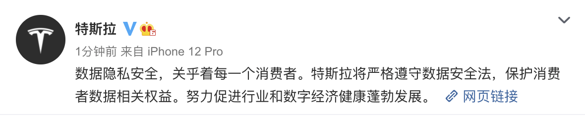 6月11日上午,@特斯拉 微博发布公告称:“数据隐私安全,关乎着每一个消费者。特斯拉将严格遵守数据安全法,保护消费者数据相关权益。努力促进行业和数字经济健康蓬勃发展。”
