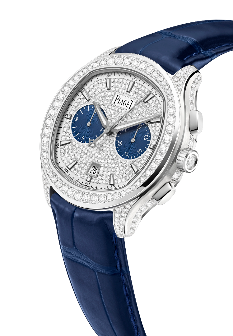 另一款PIAGET伯爵Polo系列计时腕表,让那些希望展现魅力的男士们有了密镶钻款的选择。PIAGET伯爵Polo系列密镶钻款计时腕表采用直径42毫米的18K白金表壳,表盘、表圈及表壳皆密镶璀璨美钻,钻石由小至大依次排列并镶嵌于表圈上,以此强调腕表标志性的枕形表壳,搭配蓝色鳄鱼皮表带,兼具运动外形与时尚气质。