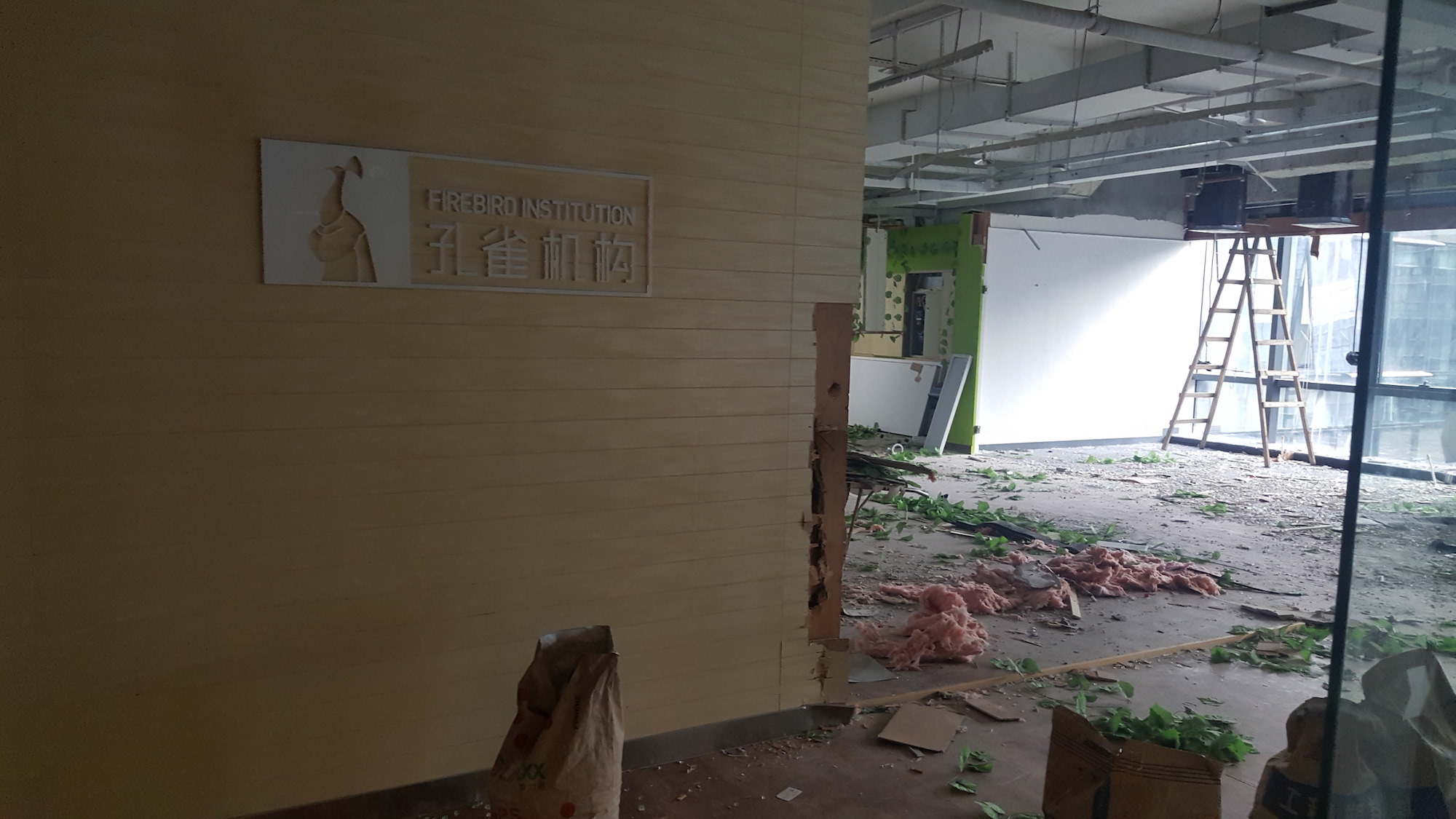 今天一早,物业公司开始清场,并对孔雀机构进行拆除。记者到场发现,之前孔雀已装修近半的新空间被拆的七七八八,曾经门庭若市的餐厅也已经清空,工作人员对此并不愿意多评论一句。