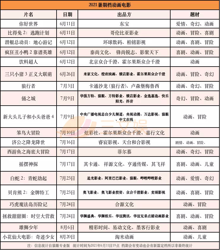 据三文娱统计,截至2021年6月11日19点,已公布定档时间在6月11日至8月31日的动画电影就达到了19部,其中4部进口动画电影,15部国产动画动画电影。