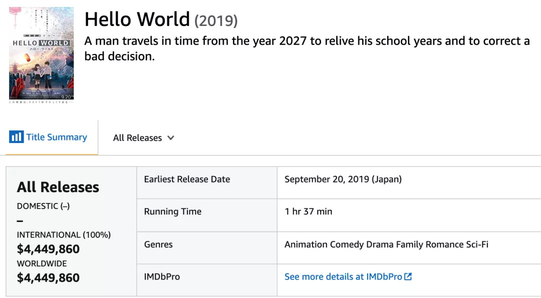 该片已于2019年9月20日在日本上映,已结束放映的国家和地区还包括新加坡、菲律宾、意大利,中国香港和中国台湾。据第三方数据统计显示,《你好世界》在日本取得了439.61万美元的票房,而其在中国香港的票房为5.38万美元。