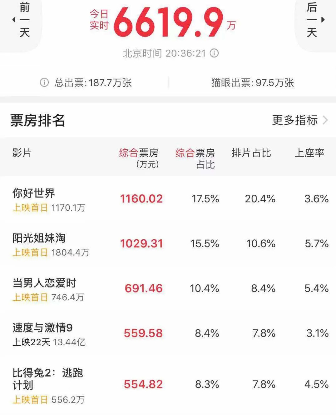 根据猫眼专业版的统计显示,6月11日《你好世界》在中国大陆的排片为7.6万场,以20.4%的排片占比拿下了超1160万元票房,居当日票房排行之首。