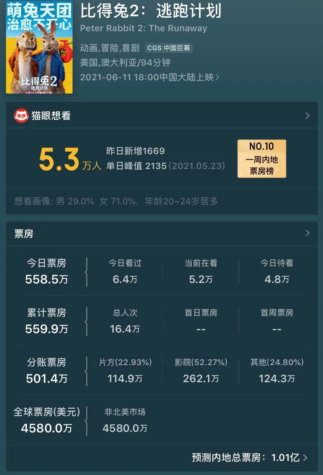 根据猫眼专业版的统计显示,6月11日《比得兔2:逃跑计划》上映首日的票房未及600万元。但是,这是在该片只有2.9万场排片的情况下取得的票房成绩,6月12日端午档的第一天《比得兔2:逃跑计划》的排片将提至5.6万场。