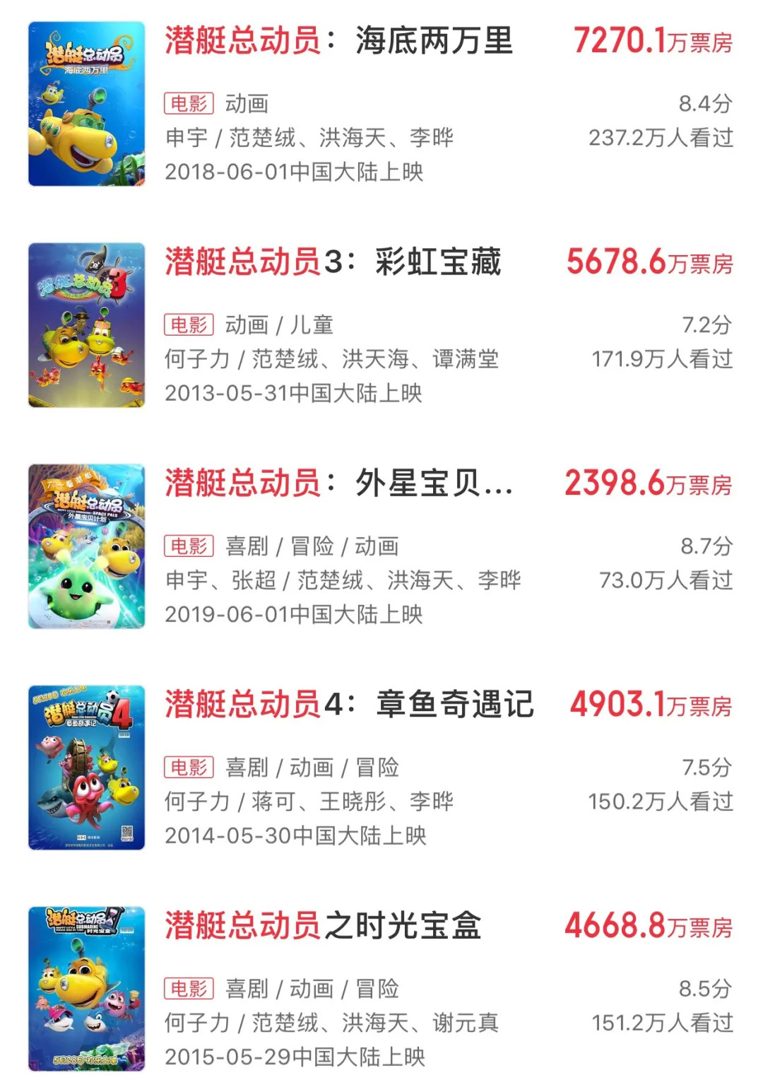 此前在中国大陆上映的系列影片票房也多在5000万元左右。如《潜艇总动员:海底两万里》票房7270.1万元,《潜艇总动员3:彩虹宝藏》5678.6万元。