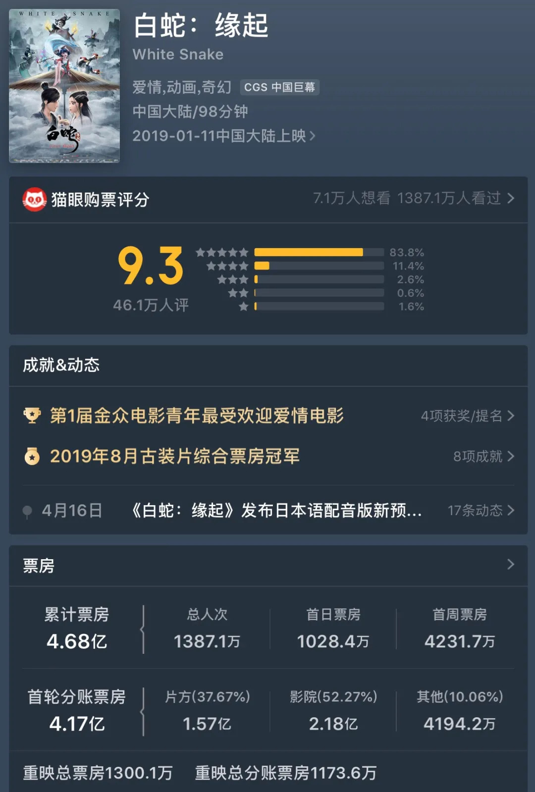 据第三方数据统计显示,《白蛇:缘起》的票房为4.68亿元。(回顾:专访《白蛇:缘起》导演黄家康、赵霁)