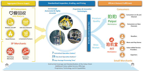 根据公开信息,万物新生是一家“互联网+环保”类型的循环经济企业,旗下业务线包括爱回收(二手3C产品C2B回收平台)、拍机堂(二手3C产品B2B交易平台)、拍拍(二手优品B2C零售平台)及AHS Device(海外业务)等,横跨产业链供需两端,服务覆盖从回收、检测、评级、定价到再销售的全流程。
