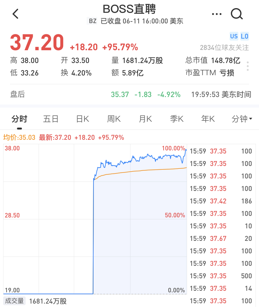 开盘后BOSS直聘股价直接拉涨,收盘价37.2美元,涨95.79%,总市值148.78亿美元。今日成交量1681.24万股,成交额5.88亿美元。