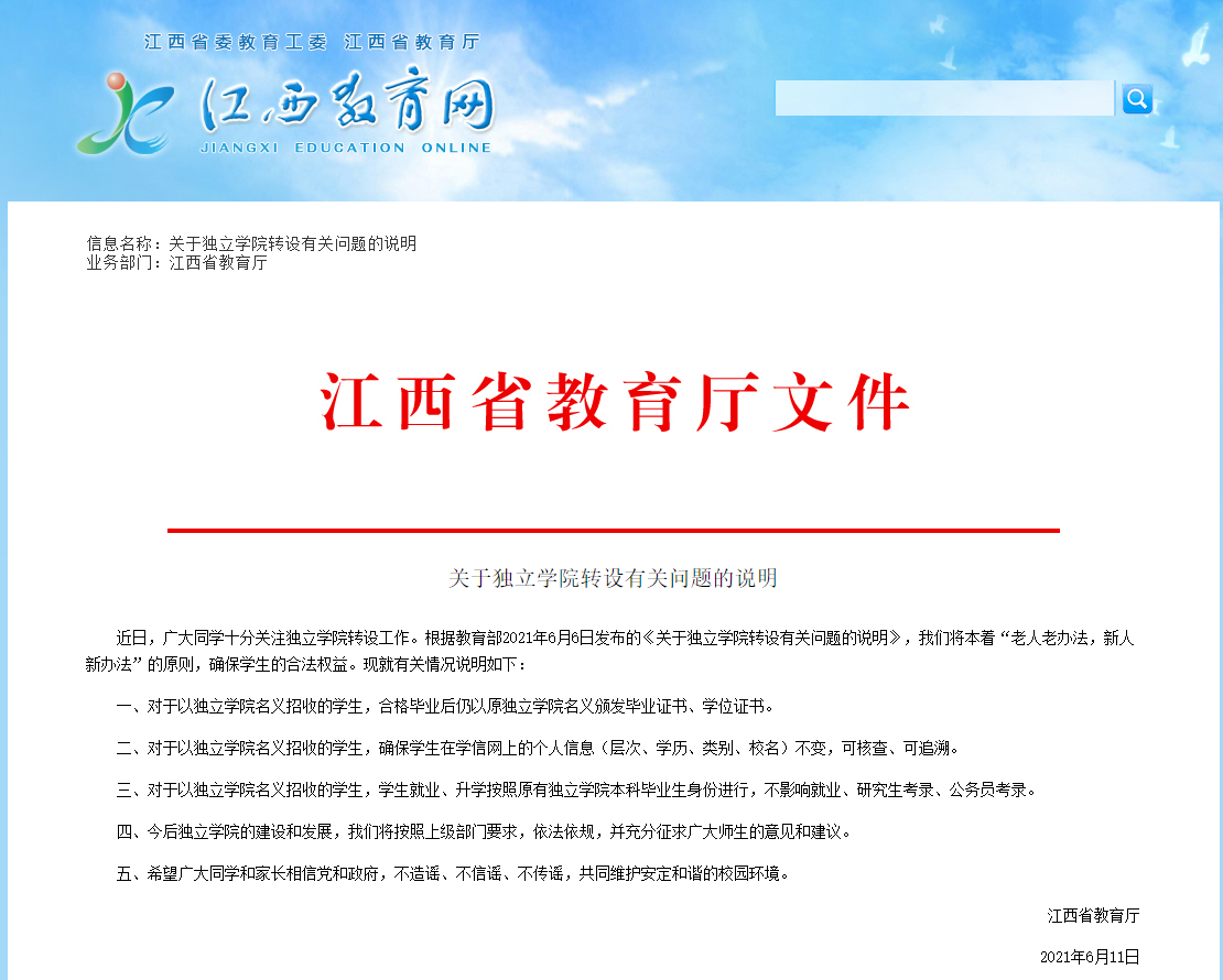 据江西省教育厅网站6月11日消息,江西省教育厅发布关于独立学院转设有关问题的说明。对于以独立学院名义招收的学生,合格毕业后仍以原独立学院名义颁发毕业证书、学位证书。确保学生在学信网上的个人信息(层次、学历、类别、校名)不变,可核查、可追溯。学生就业、升学按照原有独立学院本科毕业生身份进行,不影响就业、研究生考录、公务员考录。