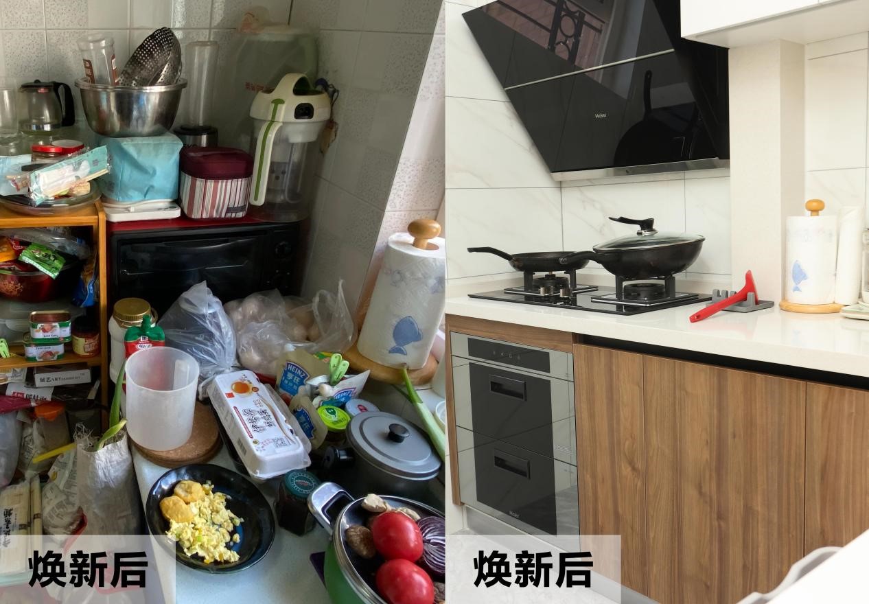 而邵阿姨这些生活难题的解决方案,就是三翼鸟!在焕新三翼鸟厨房之后,让她感受最深的是厨房不拥挤了,做饭流程更顺畅了。之前老厨房各种杂物随意堆放,让厨房越用越小,而三翼鸟对厨房空间进行了全新布局,不仅做满吊柜增加储物空间,还把冰箱与整体橱柜融为一体,扩大活动区域后,给人带来一种宽阔的感觉。
